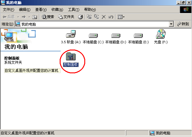 第一步,打开我的电脑,找到“控制面板”选项,双击打开(见下图红圈中的部分)。